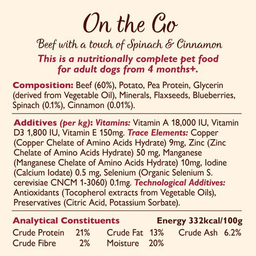 On the go beef. This is a nutritionally complete pet food for adult dogs from 4 months+.