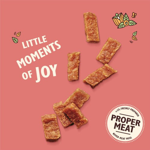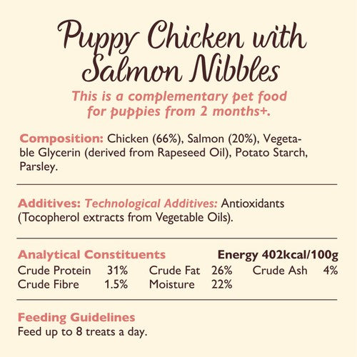Lily's Kitchen Chicken & Salmon Nibbles offer a delicious and complementary food source designed for puppies aged two months and older. These mini jerky-style bites are gently baked to achieve a flexible, chewy texture dogs enjoy. The recipe is grain-free and contains natural ingredients providing valuable protein.