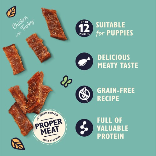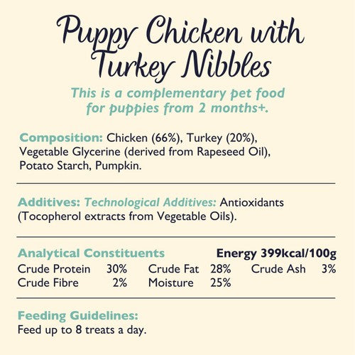 Reward your growing puppy with these naturally made Chicken & Turkey Nibbles from Lily's Kitchen. These small, tempting treats are packed full of proper meat suitable for training or snacking at any point during the day. They are specially formulated without any added grains, supporting healthy development for your young dog.
