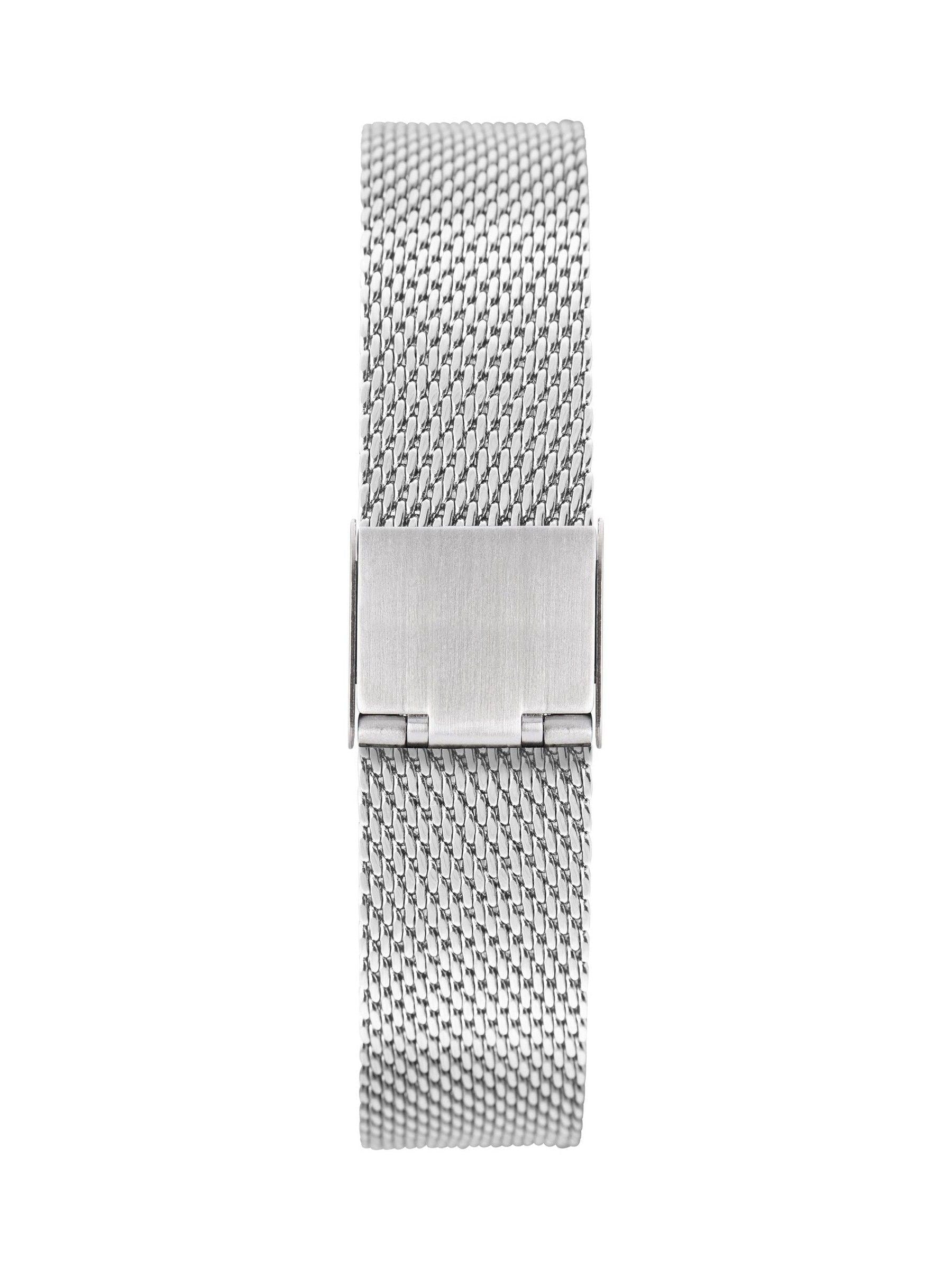 This watch features a round, silver-coloured, coin edge alloy case housing a silver/white sandblast dial with silver baton hour markers. Fastened with a silver stainless steel mesh bracelet.