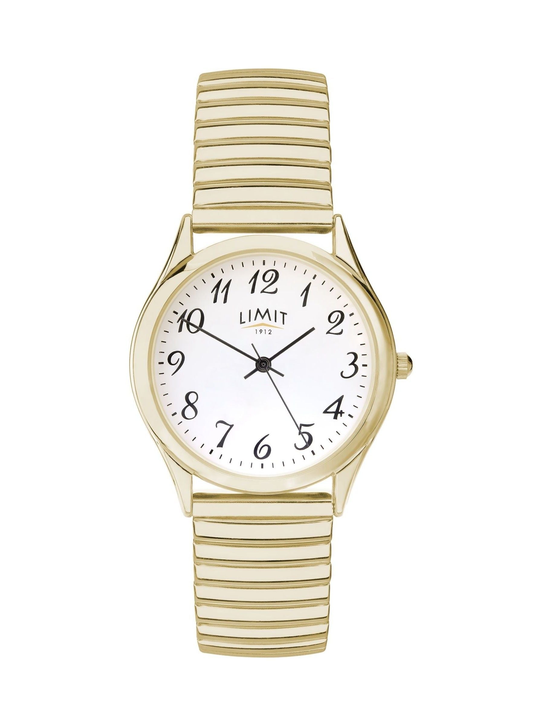 This watch features a round, plated gold alloy case housing a white dial. The watch is fastened with a gold plated, stainless steel expander bracelet.