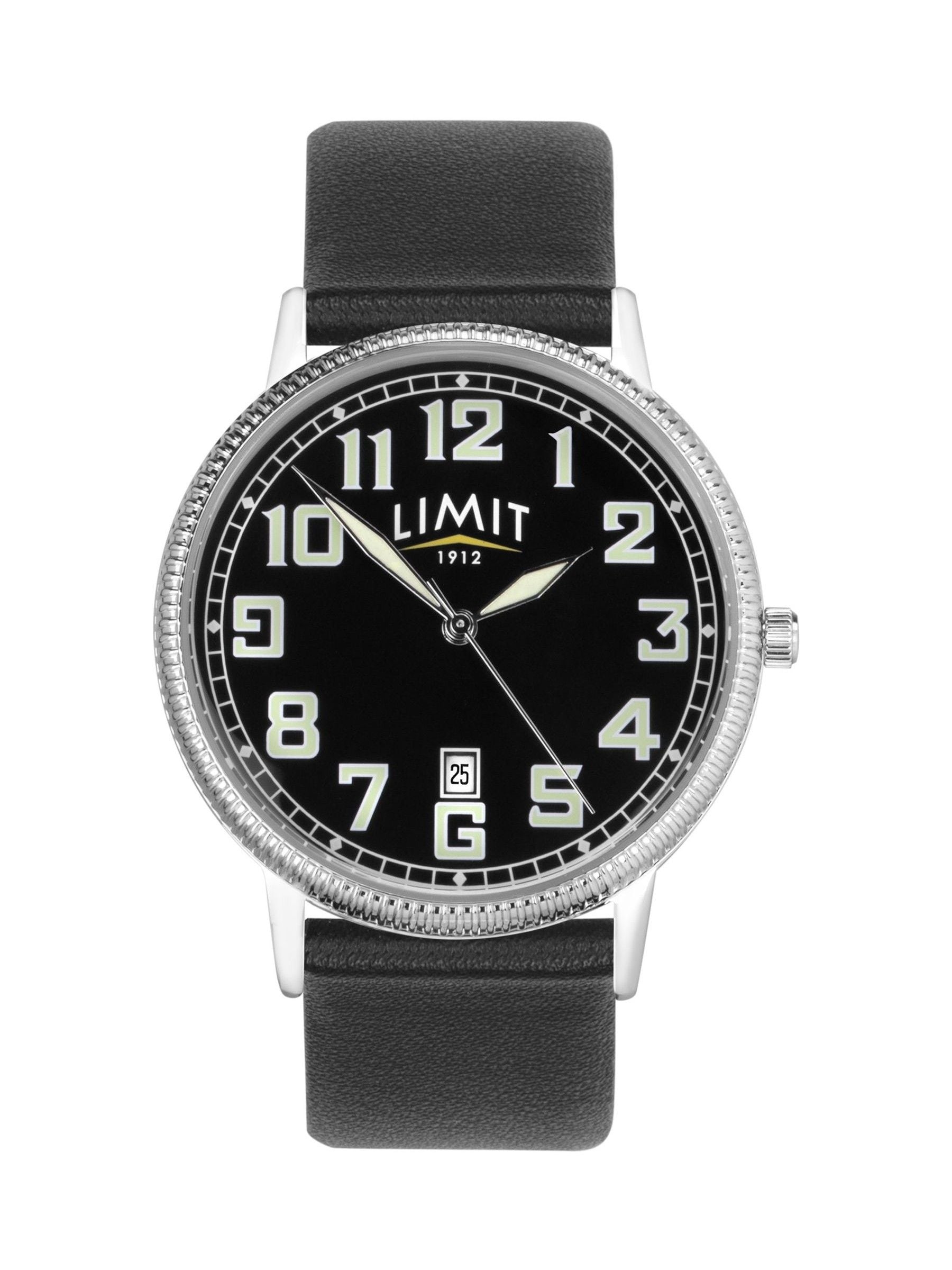 This men's watch fastens with a black padded PU strap. The watch has a round silver plated alloy case with a black dial and a date display.
