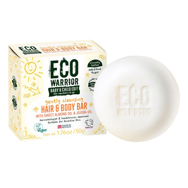 Travel size: 50g Allergen-free orange blossom scent Enriched with chamomile extract Suitable for newborns and children Vegan, Cruelty & Plastic Free The Eco Warrior Baby & Child Edit offers a range of cost-effective, eco-friendly, and multi-functional 2-in-1 shampoo and body wash bars designed for newborns and up. Formulated with natural ingredients, these bars are free from SLS, sulphates, alcohol, parabens, sorbates, and silicones. Dermatologist and paediatrician approved, they are clinically tested to be suitable for sensitive skin. Each bar is soap-free, pH balanced, and features a biodegradable, plastic-free design. Their ergonomic shape is easy to hold, making bath time simple and enjoyable. Lather bar into wet hands, then gently massage over hair & body before rinsing with warm water. Formulated with chamomile extract, sweet almond oil, and jojoba oil, this bar helps soothe sensitive skin and promote healthy hair. The allergen-free orange blossom fragrance adds a refreshing, gentle scent. Ideal for daily cleansing, it leaves skin soft and nourished. Jojoba Seed Oil – Naturally gentle and non-irritating, with anti-inflammatory properties and vitamins A, D, and E. Sweet Almond Oil – Rich in vitamin E and magnesium, supporting hair growth and strength. Chamomile Extract – Calms irritation with its anti-inflammatory and antioxidant properties. They are plant-based, vegan, and Leaping Bunny certified cruelty-free, offering a sustainable and gentle choice for your baby's skincare routine.