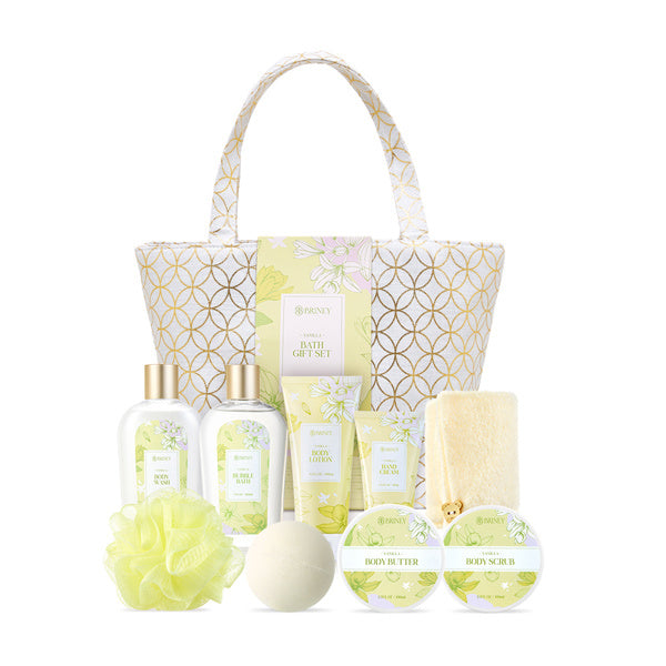 - colour Scent: Vanilla Number of Items: 10 Package Content: 1 x Body Wash (200ml) 1 x Bubble Bath (200ml) 1 x Body Lotion (100ml) 1 x Body Scrub (100ml) 1 x Hand Cream (50ml) 1 x Bath Bomb (100g) 1 x Body Butter (100ml) 1 x Hair Turban Towel 1 x Shower Pouf 1 x Storage Tote Bag