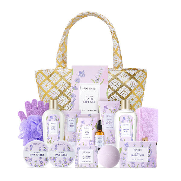 - colour Scent: Lavender Number of Items: 15 Package Content: 1 x Body Wash (200ml) 1 x Bubble Bath (200ml) 1 x Body Lotion (100ml) 1 x Body Scrub (100ml) 1 x Hand Cream (50ml) 1 x Bath Bomb (100g) 1 x Body Butter (100ml) 1 x Massage Essence Oil (50ml) 1 x Bath Salt (100g) 1 x Scented Candle (50g) 1 x Soap (100g) 1 x Hair Turban Towel 1 x Shower Pouf 1 x Loofah Glove 1 x Storage Tote Bag