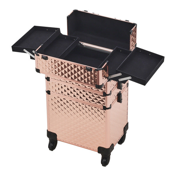 telescopic handle and flexible wheels ensure easy mobility multifunctional cosmetic case makes efficient use of the large interior space sidelock design makes it easy to assemble and disassemble each layer specifications overall dimension 35 w x 25 d x 61 h first layer height 17 material aluminum mdf plastic velvet colour rose gold and black compartments yes drawers included no wheels included yes plugin no assembly required yes package included 1 x cosmetic travel case