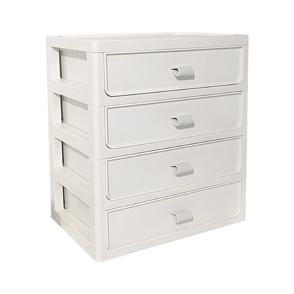 [High Durability]: Made of plastic, it is easy to care for and highly durable. [Safe to Use]: Featuring smooth lines and rounded edges, it prevents hand injuries. [Space-saving]: Its compact design allows for efficient use of your desktop space, saving room. [Non-slip Base]: The base is designed with a thickened non-slip feature, providing stability. Specifications Overall Dimensions: 26cm W x 15.5cm D x 29.5cm H Material: Plastic + Silicone Colour: White Shape: Rectangular Product type: Storage Box Mounting Type: Freestanding Number of Drawers: 4 Handle Included: Yes Assembly Required: No Package Content 1 x Storage Box