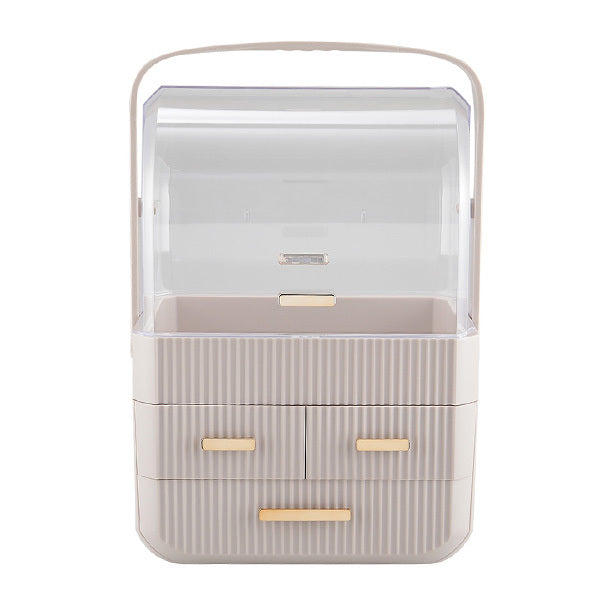 The box includes three drawers, two of which are smaller, ideal for holding items like lipsticks and mascaras. The bottom drawer can accommodate foundations, and the handle is made for easy movement.