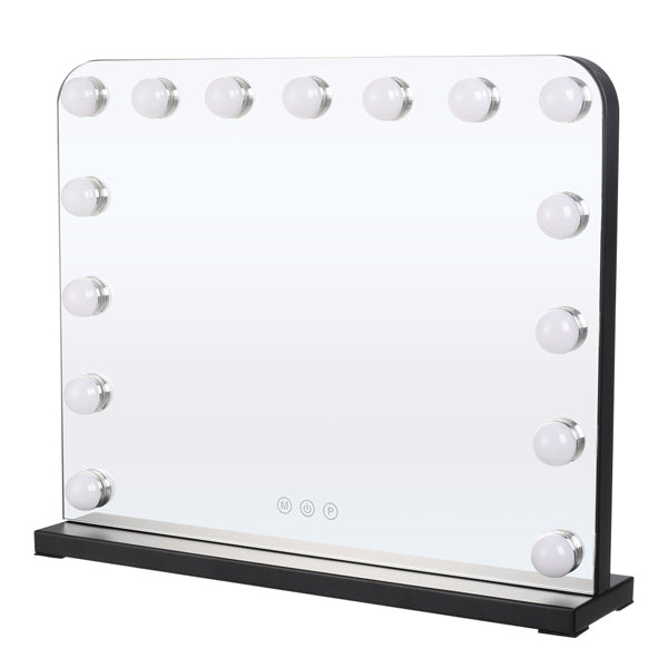 15 brightness adjustable led bulbs in three colour modes slim mirror frame with rounded edges for a stylish look nondetachable sturdy metal base for reliable stability overall dimensions 50cm w x 12cm d x 40cm h base dimensions 50cm w x 12cm d x 2cm h mount type freestanding material metalparticleboardglass power source plugin plug included yes lighting included yes bulbs included yes number of bulbs 15 dimmable lighting yes
