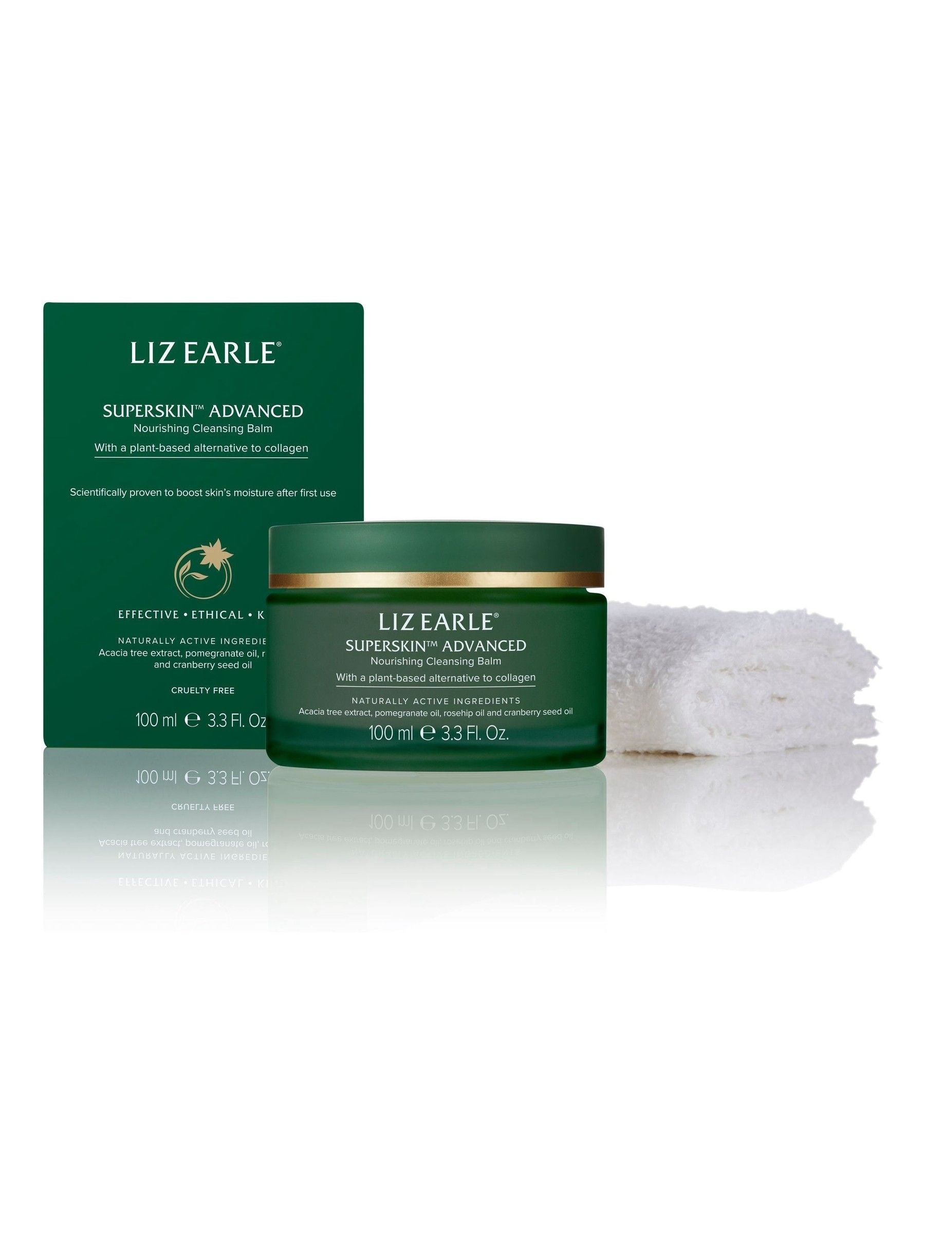 Helps skin regain the look of youthful volume in one ultra-nourishing cleanse.Help your skin regain the look of youthful volume in one ultra-nourishing cleanse, with Superskin™ Advanced Nourishing Cleansing Balm. Gently remove impurities whilst boosting moisture to reveal instantly plumper, smoother looking skin. Our luxurious formula is powered by acacia tree extract, the plant-based alternative to collagen, that helps to improve the look and feel of skin that s experienced collagen loss. Infused with pomegranate oil, this balm reveals skin that looks instantly hydrated and visibly transforms the appearance of your skin after two weeks. Visibly plumps your skin. Provides deep, scientifically proven moisture boost. Cruelty free and certified under the Leaping Bunny Program. For all skin types, including sensitive90% saw skin look more rejuvenated*86% agreed skin looked more plump. 86% agreed that skin felt firmer. 95% agreed felt more toned. Consumer study of 113 women results after two weeks. Warm a pea-sized amount between palms and massage over face, neck and decolletage. Moisten finger tips to emulsify the balm into a milk. Remove with our warm, damp cleansing cloth.