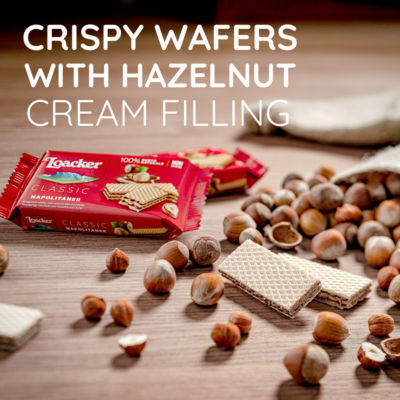 Product InformationCrispy wafer cubes with hazelnut cream filling. Made with 100% Italian hazelnuts sourced from our orchard sustainability program and freshly roasted by Loacker.