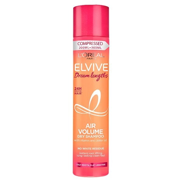 discover elvive dream lengths air volume dry shampoo by loreal paris for longlasting volume and an airy clean feeling for up to 24 hours part of the inbetween washes style extender range to style hair and maximise care without water it leaves hair with instant volume and a clean feeling from roots to lengths the unique formula has an ultrahigh cleansing ability with no white residue enriched with vitamins to care for your hair leaving it soft and scented for up to 24 hours with dream lengths iconic scent effective on long hair thats prone to greasiness or just in need of a refresh to apply spray evenly 15cm from hair roots in between washes massage into roots and brush through backbrush hair focusing on bottom layers for volume boost recycle the aerosol can in aluminium recycling consumer test sensory test