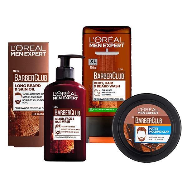 This L'Oreal Paris Men Expert BarberClub Bundle offers a complete 4-step regime inspired by professional barber expertise. It is designed for comprehensive cleaning, care, and styling of your body, face, and hair. The formula is enriched with cedarwood essential oil, ensuring a distinctive, luxurious woody fragrance remains post-use.