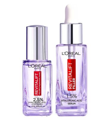 This duo pack pairs the L'Oréal Paris Revitalift Filler 1.5% Hyaluronic Acid Serum with the dedicated Eye Serum. This set delivers concentrated doses of hyaluronic acid for comprehensive facial hydration and plumping action. The facial treatment focuses on intensive moisture to smooth the complexion.