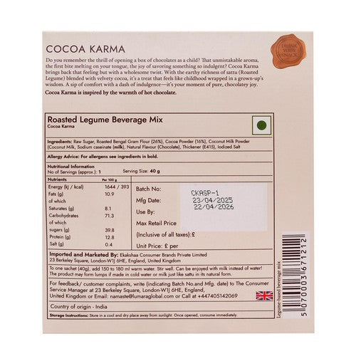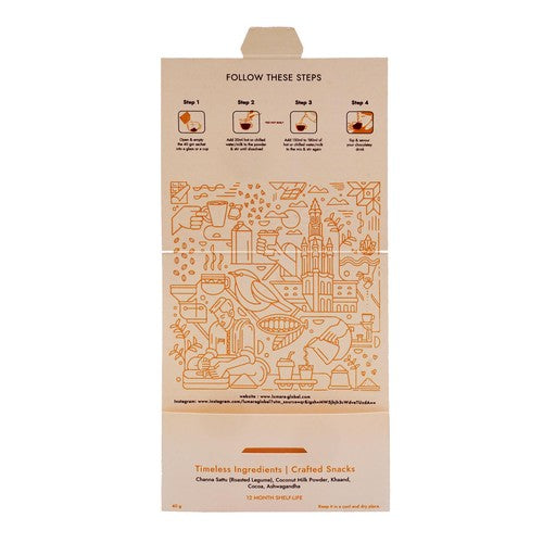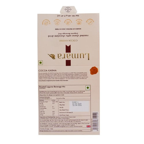 Lumara Cocoa Karma blends the earthy richness of roasted chana sattu with velvety cocoa for a nostalgic experience. This wholesome preparation recalls the simple joy of childhood chocolate treats in a grown-up format. It delivers a comforting yet indulgent moment reminiscent of warm hot chocolate.