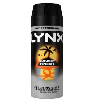 Read MoreLYNX Sunset Fresh Anti-Perspirant Aerosol keeps you smelling irresistibly fresh and feeling confident, no matter the circumstances. This men's deodorant spray boosts your fragrance game with a long-lasting mango and mandarin scent, blended with the signature LYNX effect to leave you wanting more.