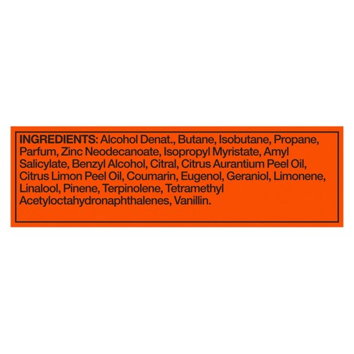 INGREDIENTS: Alcohol Denat., Butane, Isobutane, Propane, Parfum, Zinc Neodecanoate, Isopropyl Myristate, Amyl Salicylate, Benzyl Alcohol, Citral, Citrus Aurantium Peel Oil, Citrus Limon Peel Oil, Coumarin, Eugenol, Geraniol, Limonene, Linalool, Pinene, Terpinolene, Tetramethyl Acetyloctahydronaphthalenes, Vanillin
