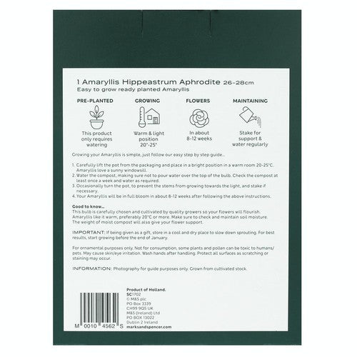This M&S Aphrodite Amaryllis arrives ready planted in a decorative pot, requiring only water to initiate growth. Featuring impressive double blooms, this attractive flowering bulb will introduce vibrant colour into your home environment. Watch for the spectacular flowers to emerge within approximately 8 to 10 weeks following initial watering.