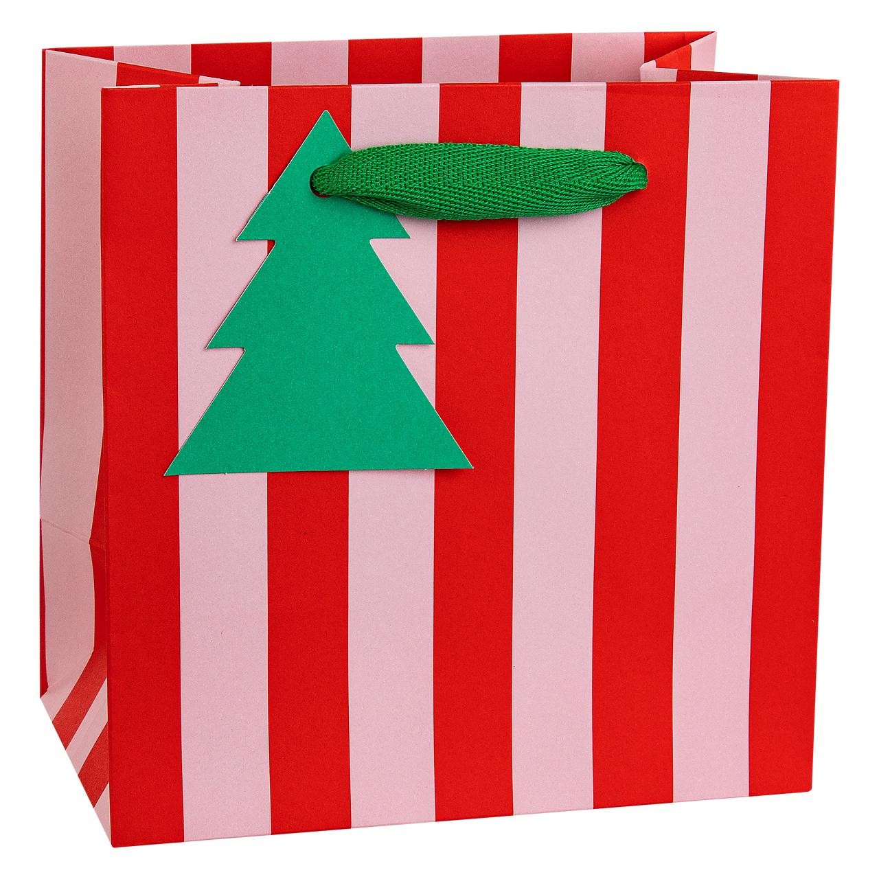 Present your festive small gift bag items in this compact M&S packaging for a vibrant presentation. It features a bright, bold red and pink striped pattern suitable for various holiday gifting needs. This single bag provides a cheerful and modern wrapping solution for small treats during Christmas.
