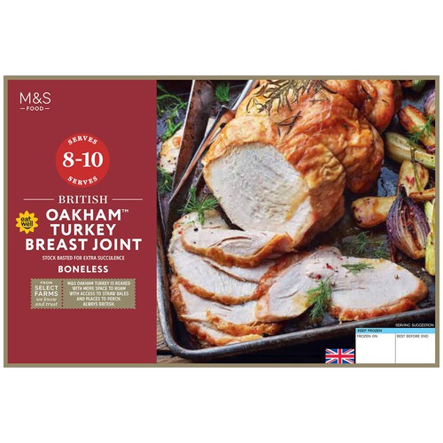 Prepare a satisfying roast with the M&S British Oakham™ Turkey Breast Joint, a frozen, boneless cut perfect for easy catering. This joint features a flavourful stock basting applied before freezing, guaranteeing moisture throughout the cooking process.