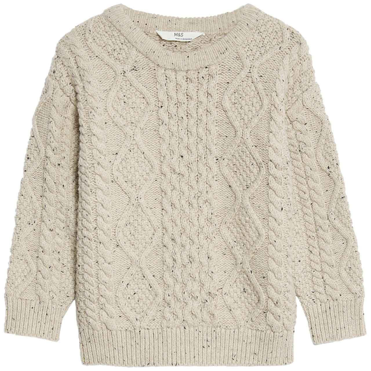 This cotton-rich jumper is designed to keep young children warm and comfortable during cooler weather. Featuring a classic regular fit, this piece showcases a traditional cable knit structure enhanced by a subtle neppy fleck within the yarn blend. It offers practical warmth alongside visual texture for everyday wear.