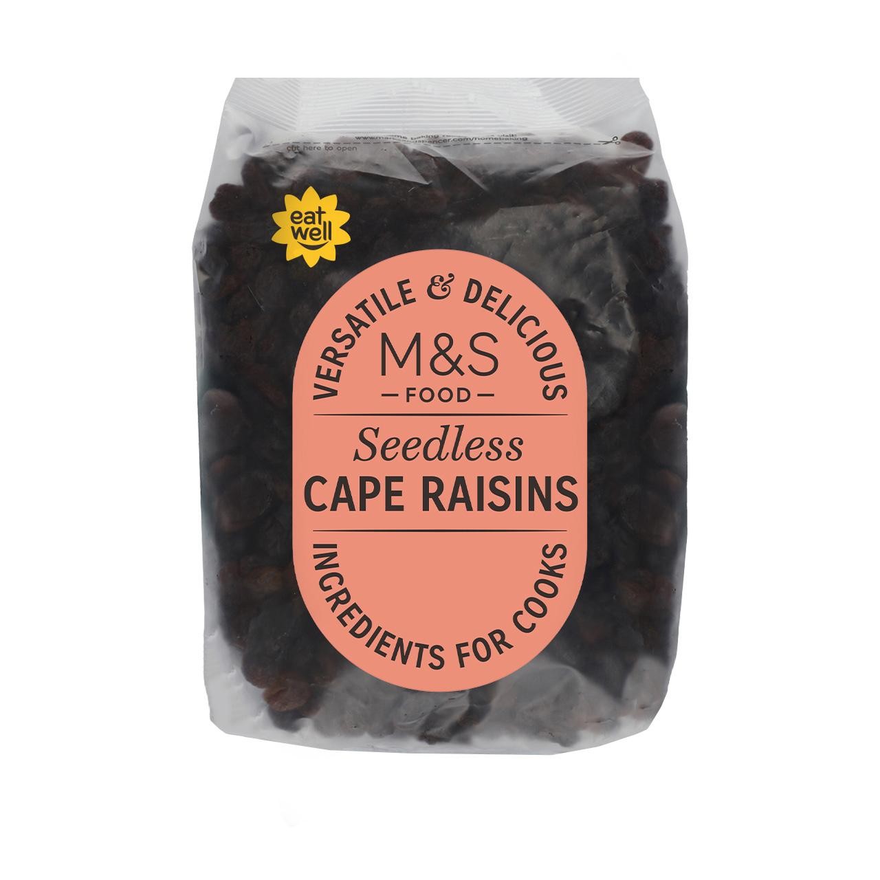 M&S Cape RaisinsAdd a distinctive flavour to sweet and savoury dishes with these Cape raisins from South Africa. Great for soaking in apple juice overnight and adding to oat and raising cookies.