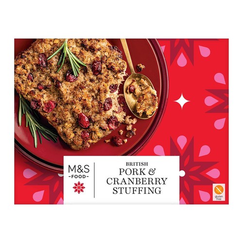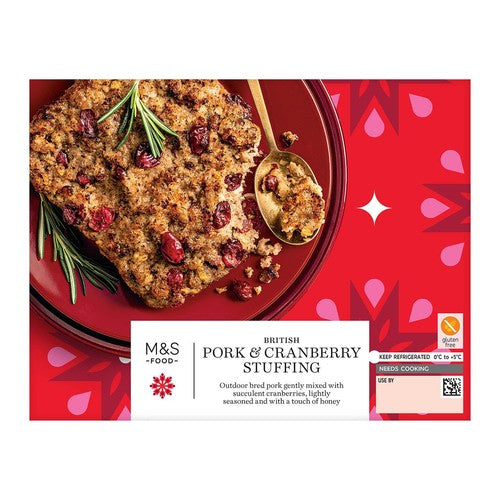 This M&S Collection stuffing features succulent cranberries expertly blended with British pork for a rich flavour profile. It is lightly seasoned throughout and finished with a subtle touch of honey, elevating this traditional side dish. This quality preparation is designed to serve six people, making it excellent for Sunday roasts or larger gatherings.