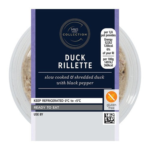 This M&S Collection Duck Rillette offers a truly special taste experience crafted with intricate attention to detail. It consists of duck meat that has been slow-cooked until tender and then finely shredded for serving. This preparation ensures a rich texture perfect for spreading onto bread or crackers.
