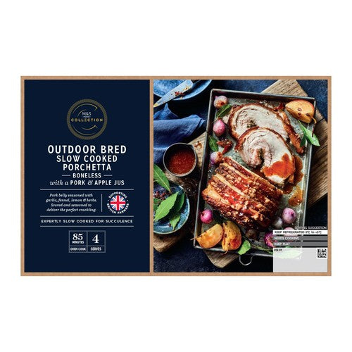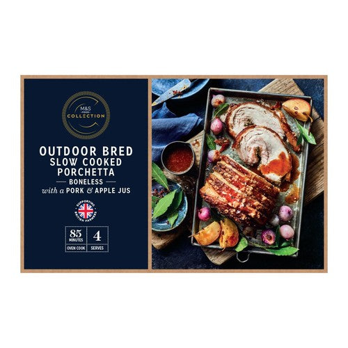 This M&S Collection Porchetta features succulent pork belly prepared using a slow-cooking process for maximum flavour and texture. The meat is rolled with a distinctive seasoning blend before being expertly scored. Finishing this joint at home ensures you achieve the crunchiest crackling.