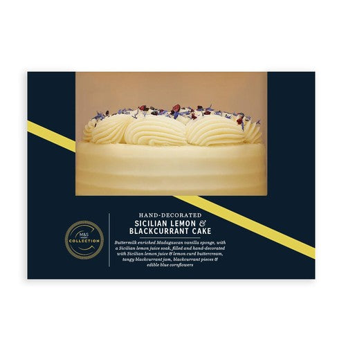 This M&S Collection cake layers three sections of buttermilk enriched Madagascan vanilla sponge. Each layer is soaked with Sicilian lemon juice for a bright, zesty base flavour profile. The filling combines Sicilian lemon juice and lemon curd buttercream with a layer of tangy blackcurrant jam for balance.