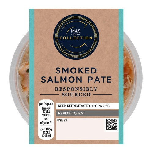 This M&S Collection Smoked Salmon Pate offers a rich and complex flavour profile, combining several textures of salmon for an indulgent experience. The base features smoked and poached Caledonian Gold™ Scottish salmon blended with sharp gherkins and salty capers for balance. This smooth base is then enhanced with distinct, flavourful toppings.