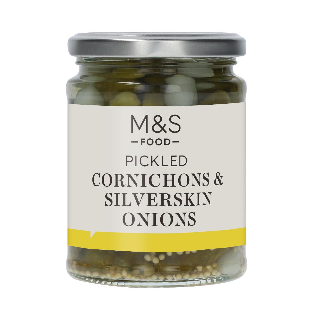 M&S Food presents a classic, ready-to-eat combination of tangy, crunchy cornichons and mild, sweet silverskin onions. This traditional mix is carefully preserved in a clear glass jar, allowing you to see the quality of the contents before opening. Enjoy this versatile pairing as a sharp addition to gourmet sandwiches or cheeseboards.
