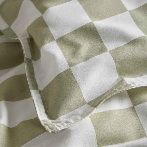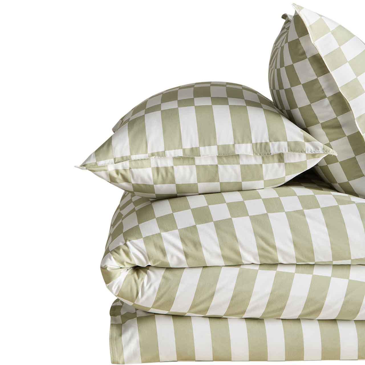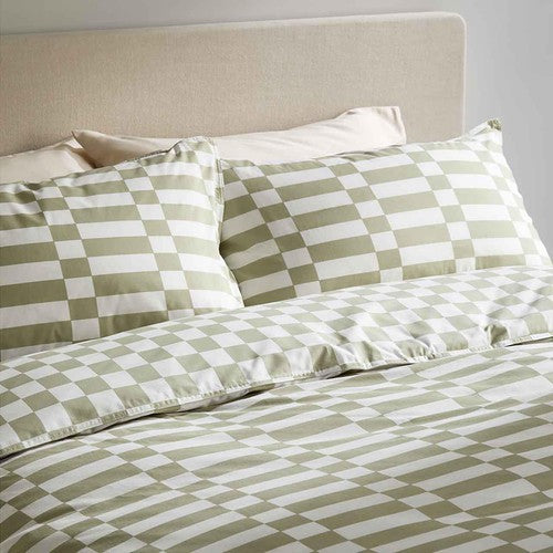 Achieve a contemporary aesthetic easily with this block geometric print cotton-rich bedding set. It features crisp percale fabric, offering a durable finish and a soft, luxurious feel against the skin. Changing linens is simple due to the included button fastening on the duvet cover. This double set in green mix updates your space effectively.