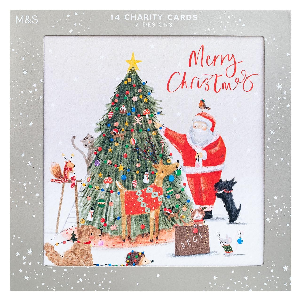 Send festive cheer with this convenient pack of 14 M&S Charity Christmas cards featuring sweet Santa and animal designs. These high-quality cards are perfect for distributing joy to friends and family this season. Purchasing this set directly helps M&S donate towards their selected charitable partners.