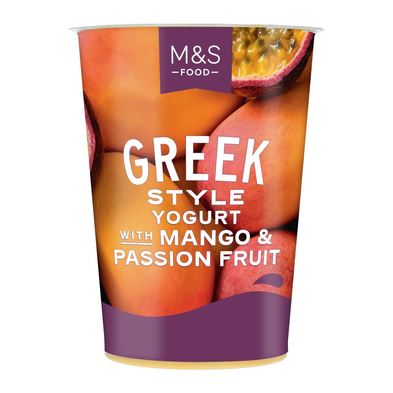 This M&S product presents a rich and creamy Greek style yogurt experience. It features distinct layers of sweet mango and tangy passion fruit. This dessert is prepared using quality British whole milk for a superior taste. It also contains beneficial live cultures, making it a thoughtfully prepared treat ready for enjoyment.