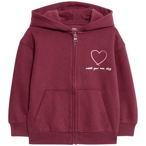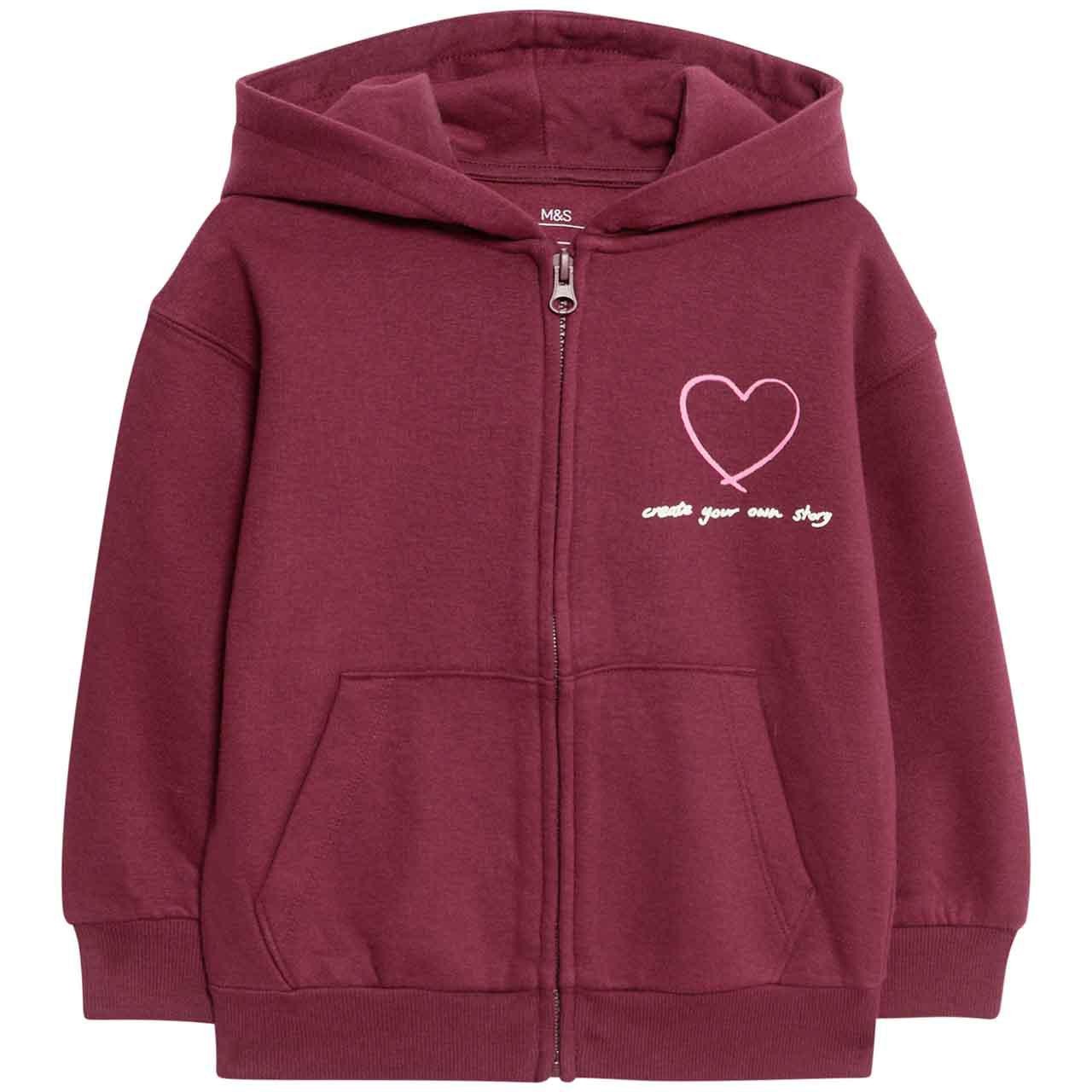 This M&S hoodie is crafted from a comfortable cotton-rich blend, providing essential softness for keeping youngsters cosy throughout the day. It is cut in a standard regular fit, offering a versatile silhouette suitable for various casual activities. The casual look is enhanced by a sweet heart graphic displayed neatly on the chest area.