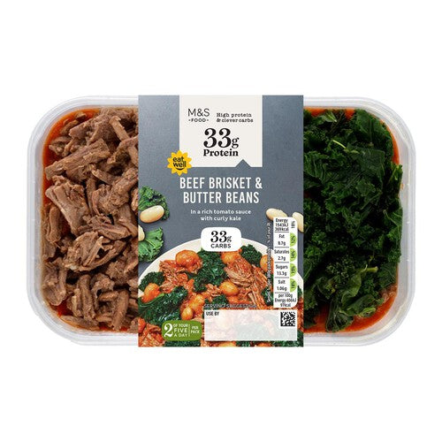 This M&S dish combines tender beef brisket with wholesome butter beans in a smoky, rich tomato sauce for a satisfying lunch option. It features added vegetables, including butternut squash and curly kale, making it a convenient high protein meal solution. This single-serving option is designed for rapid preparation when you need substantial nourishment fast.