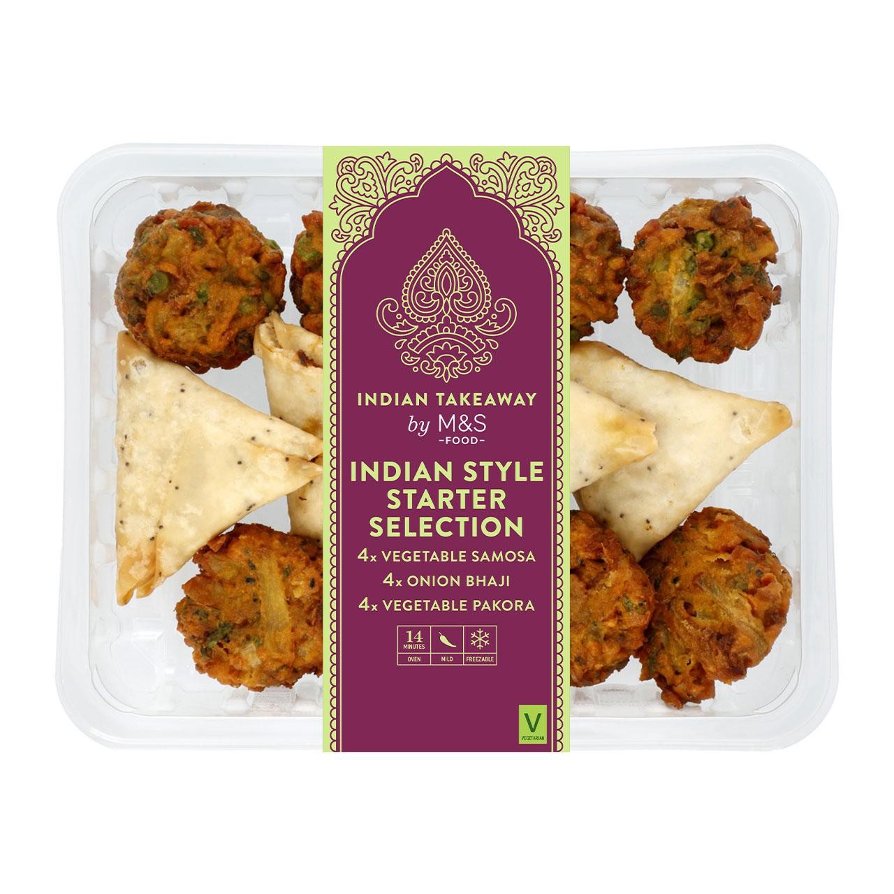 M&S Indian Starter Selectiona selection of Indian style vegetable samosas, onion bhajis and vegetable pakoras