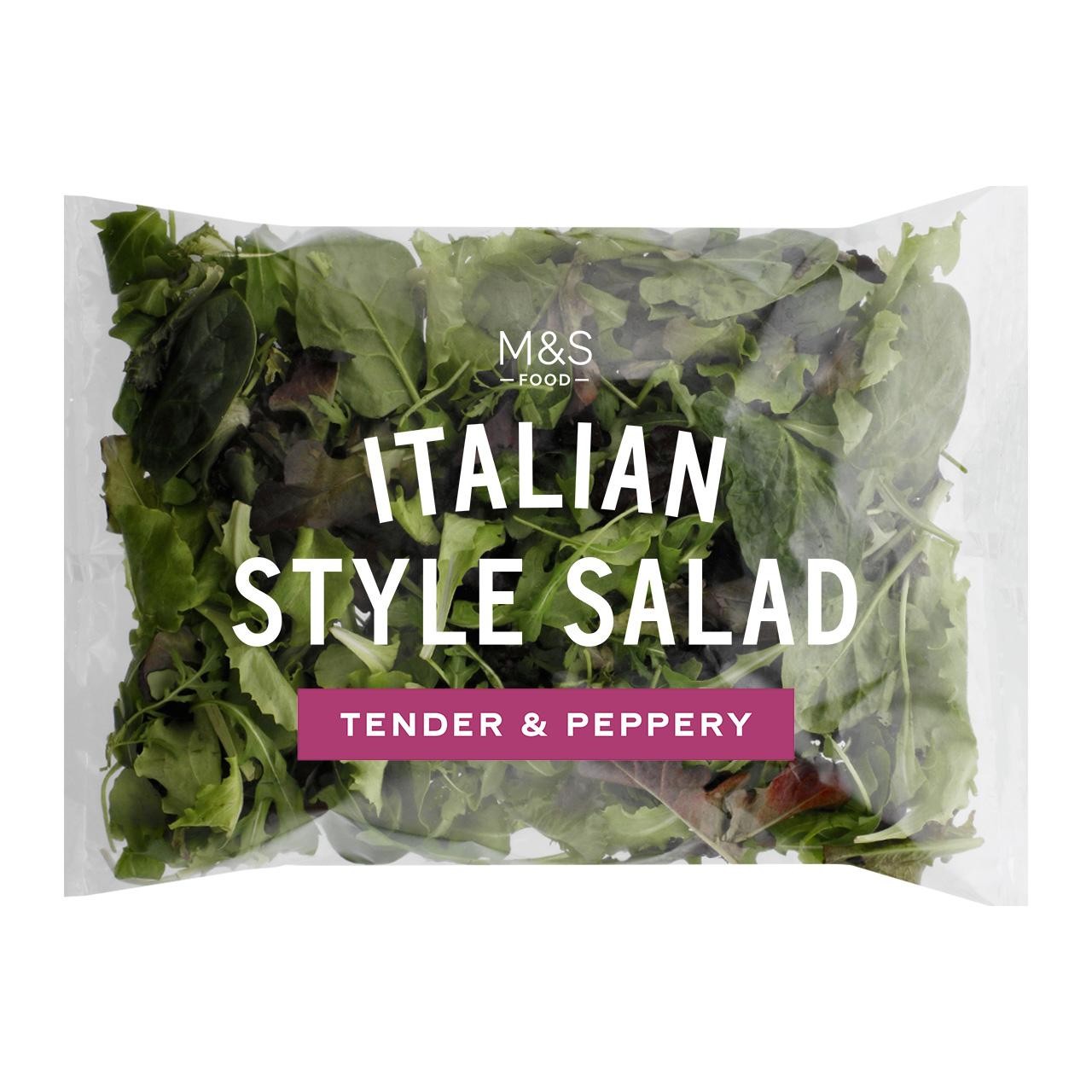 Our Italian Style salad contains a mix of:Dark red & green baby lettuceFresh and flavourful frilly leaves. Tender and smooth with a nice bit of crunch.Baby spinachA superfood stunner. Wonderfully delicate and mild, with an almost creamy texture.RocketCrisp and a little bitter, softly flowing leaves with a hot and peppery kick.Perfect pairingsToss with Parmesan shavings, toasted pine nuts and a splash of balsamic for a delicious Italian-style salad. Bellissimo!Eat a healthy variety of differently coloured vegetables and fruits each day - at least 5 portions.