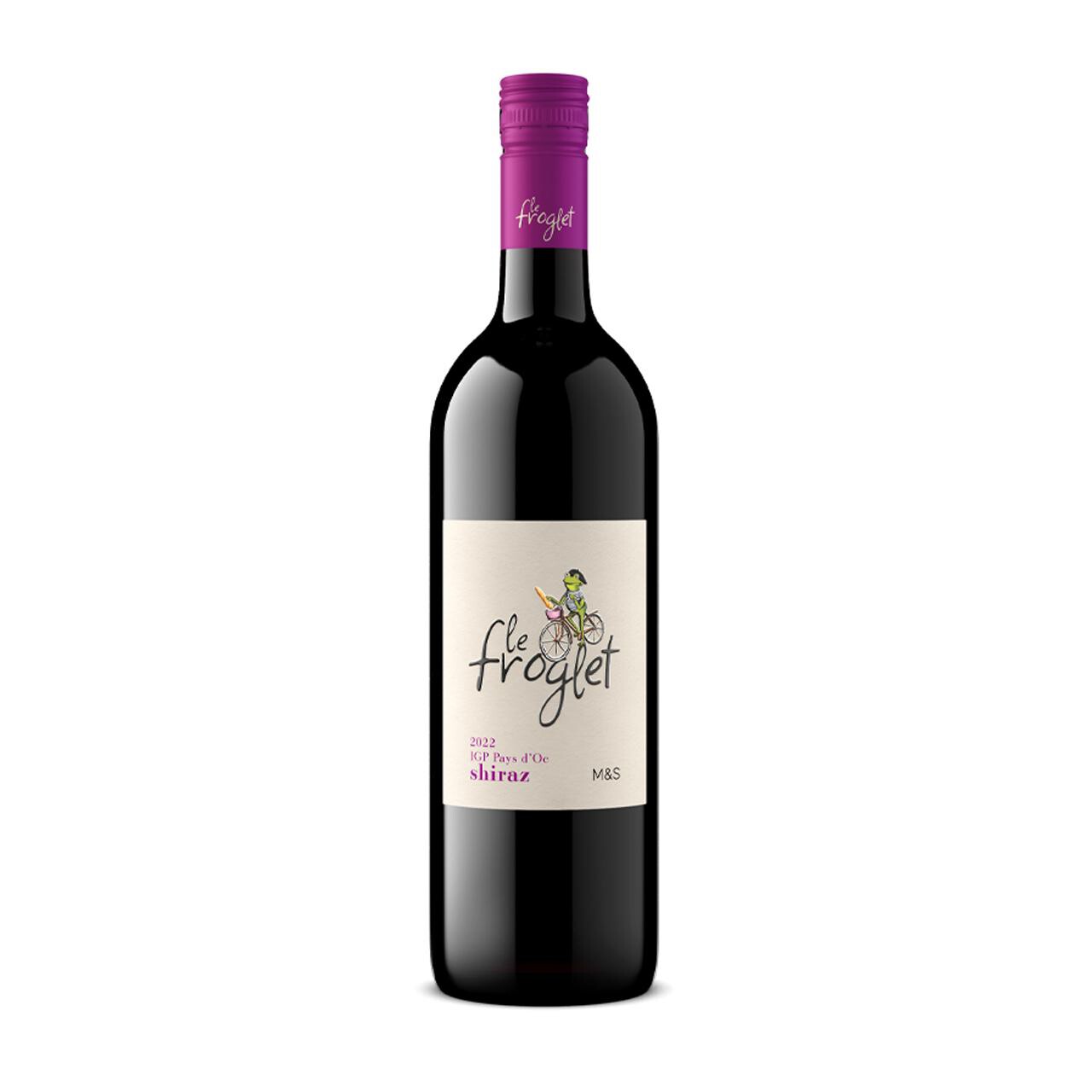 M&S Le Froglet ShirazA deliciously ripe and supple Shiraz from southern France with engaging flavours of black fruits and spice. Soft and juicy enough to be served on its own, it is also a wonderful match for hearty dishes such as lasagne, spicy meats or a cottage pie. Suitable for vegans.Â
