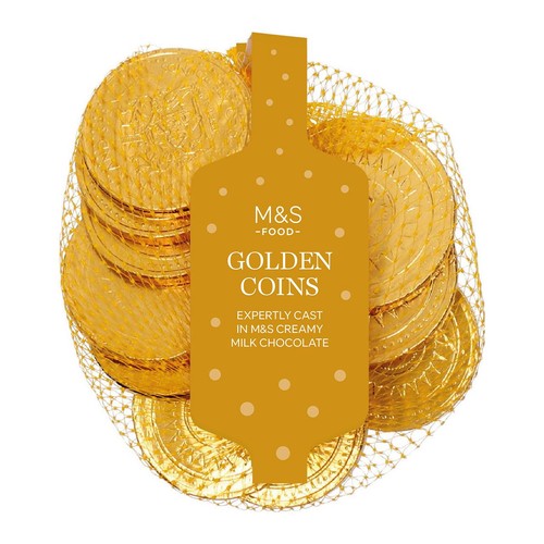 These M&S Milk Chocolate Golden Coins come foil-wrapped and are presented in an eye-catching yellow mesh net for visual appeal. This clear packaging highlights the shiny gold confectionery, making them perfect for sharing or festive occasions. The M&S branding assures quality in this classic confectionery item for your cupboard.
