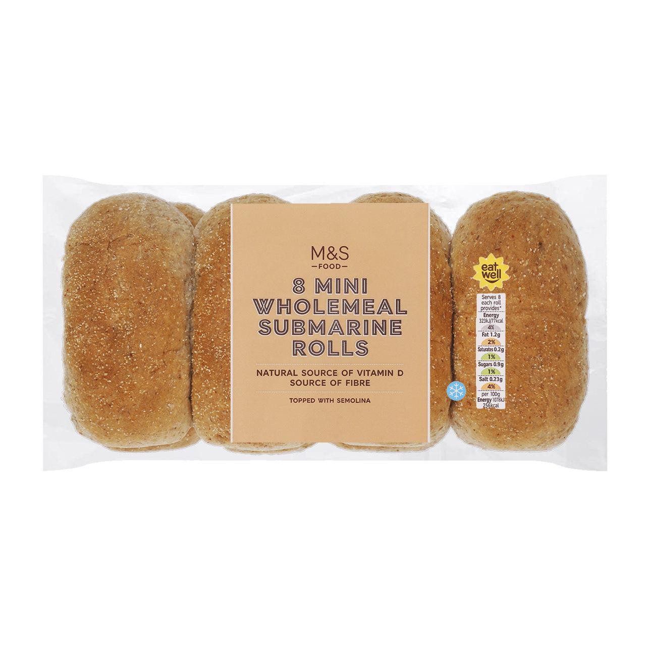 These M&S Mini Wholemeal Submarine Rolls come supplied in a convenient pack of eight. Topped lightly with semolina, these rolls offer a foundation for creating satisfying homemade sandwiches.