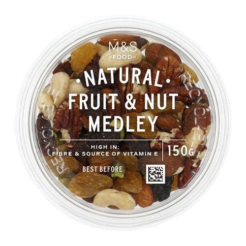 This M&S Natural Fruit & Nut Medley provides a selection of wholesome ingredients for snacking or light baking. It combines dried fruit with various nuts for varied texture and flavour profiles.