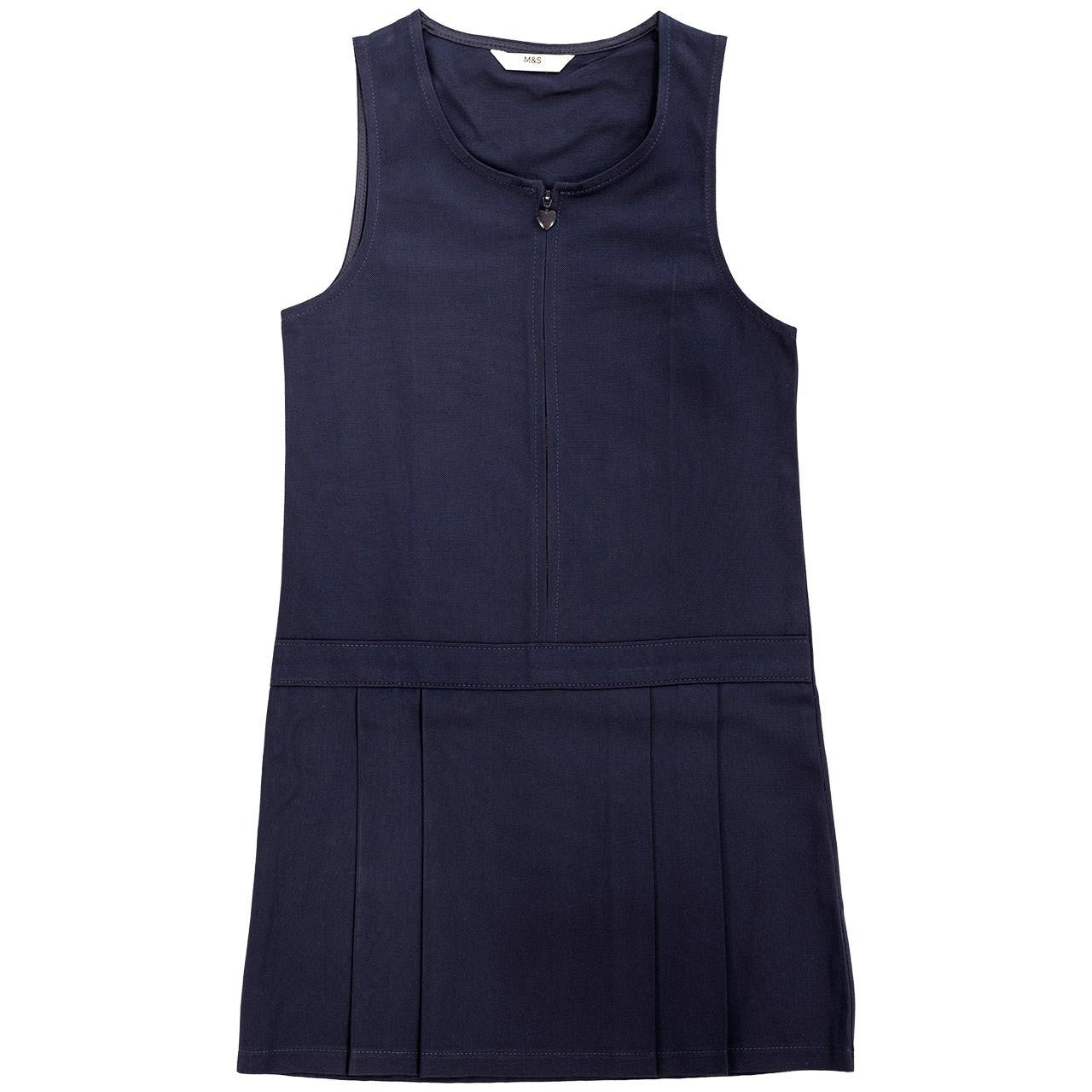 This navy pleated pinafore is designed for easy wear and long-lasting smartness. It features a zip front for simple dressing and durable fabric treatments to handle the demands of the school day. The design focuses on practicality for children and ease of care for parents.