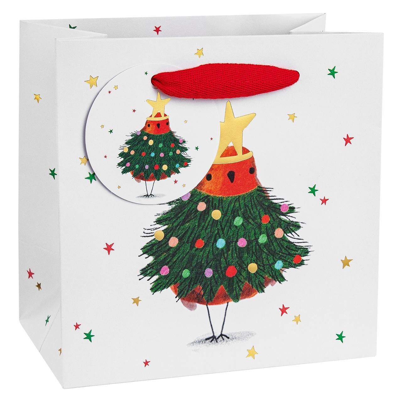 Present your festive presents appropriately in this small square M&S gift bag. It is perfectly sized for sending a little treat during the Christmas season. The design features a cheerful robin illustration complemented by detailed gold foil accents for a seasonal touch.