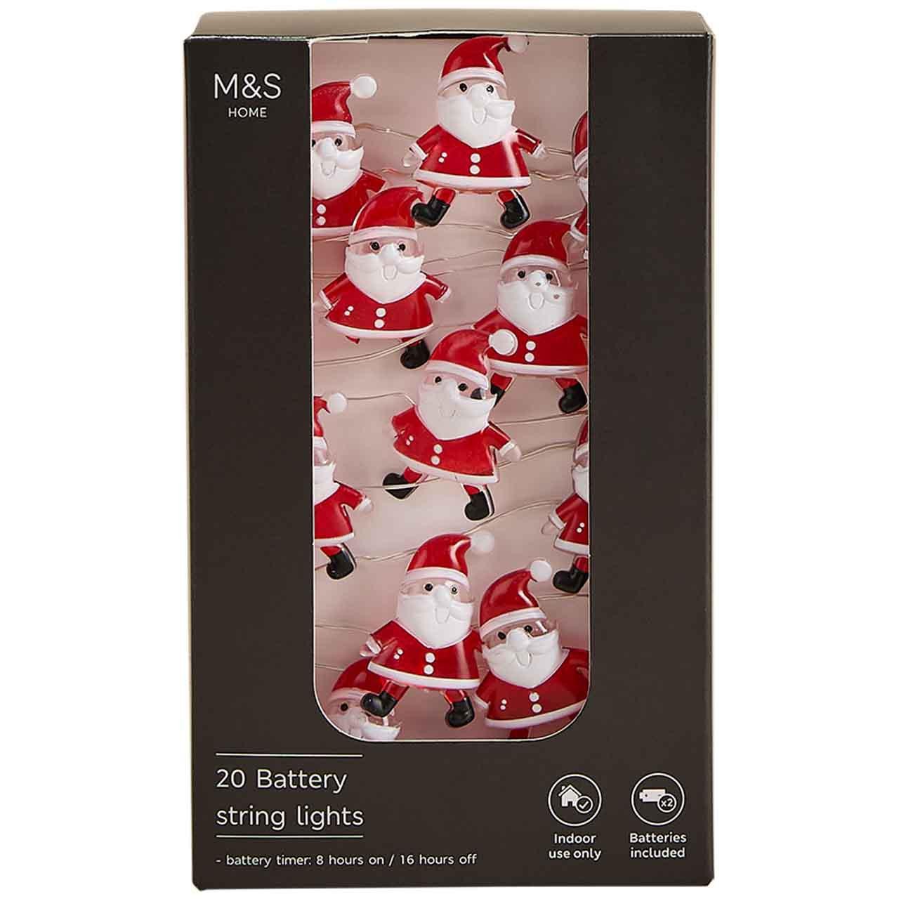 These charming M&S string lights bring a delightful festive touch to any seasonal display setting. Featuring 20 small LED bulbs shaped distinctly like Santa figures, they are designed to illuminate your Christmas tree or home decor effectively. The integrated timer function adds practicality for easy daily use throughout the holiday period.