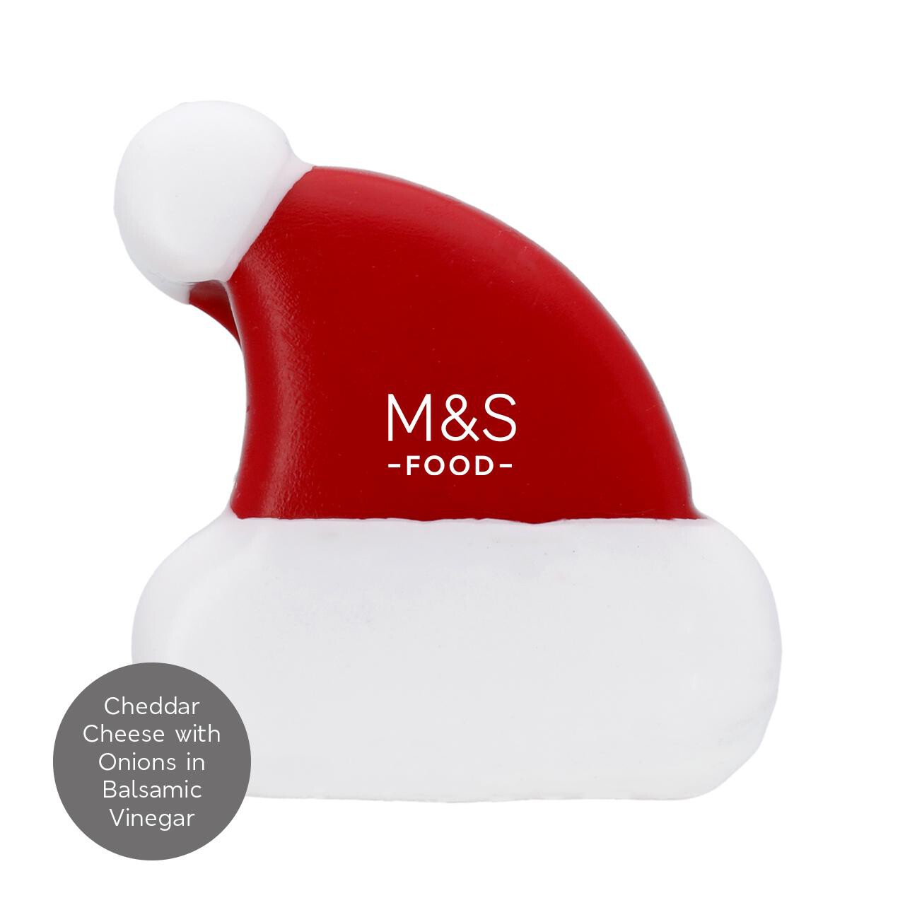 This M&S cheese offering presents a festive cheddar experience, uniquely shaped and presented for seasonal enjoyment. The cheese features added flavour elements, making it a distinct addition to any gathering.
