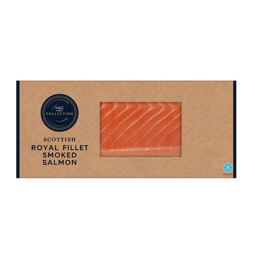 Discover the M&S Collection Scottish Royal Fillet, expertly prepared from responsibly sourced Caledonian Gold™ Salmon. This premium product is taken from the finest shoulder cut, ensuring a substantial and notably thick portion. It is renowned for balancing exceptional leanness with a beautifully buttery texture.