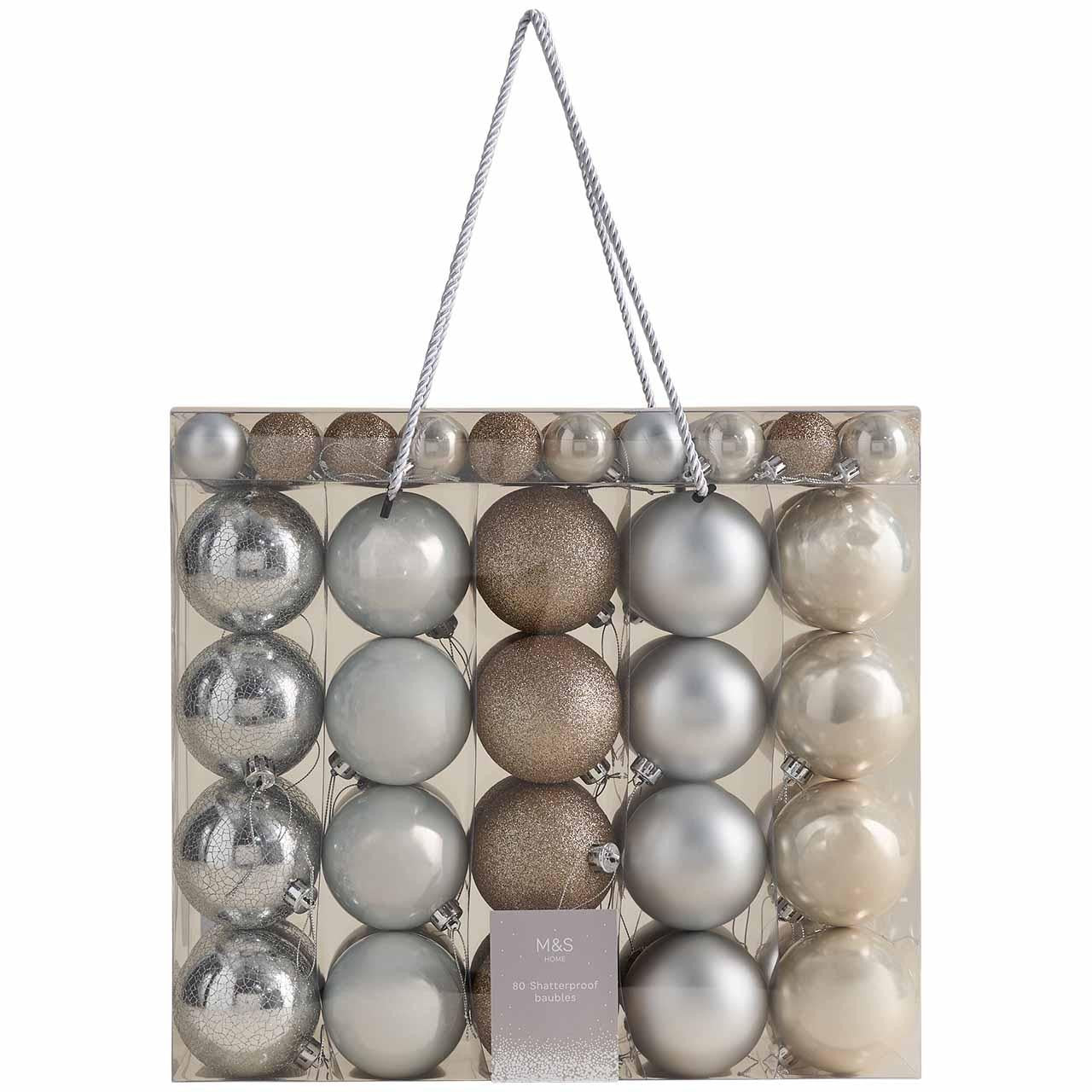 Enhance your festive display with this comprehensive set of 80 Christmas baubles from M&S. This collection is designed to decorate even the largest trees effectively, providing immediate visual impact. The shatterproof construction ensures these decorations remain a staple in your collection for many seasons.