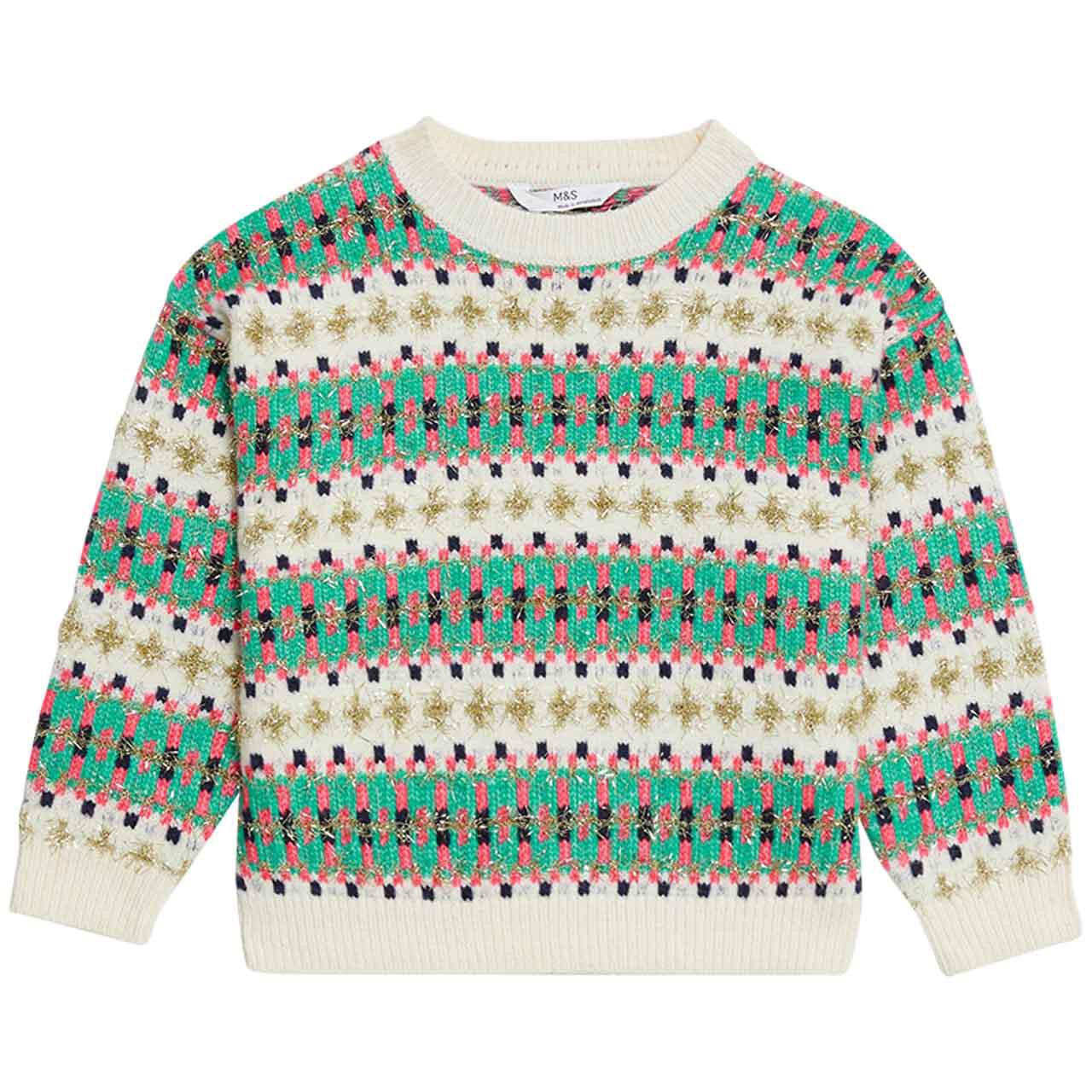 This M&S kids' jumper features a bright pattern of classic Fair Isle stripes designed to make an impact this season. It is cut in a comfortable regular fit and includes a timeless round neckline for easy dressing over cooler layers. The design is finished with ribbed trims at both the cuffs and the waistband, ensuring a neat silhouette.